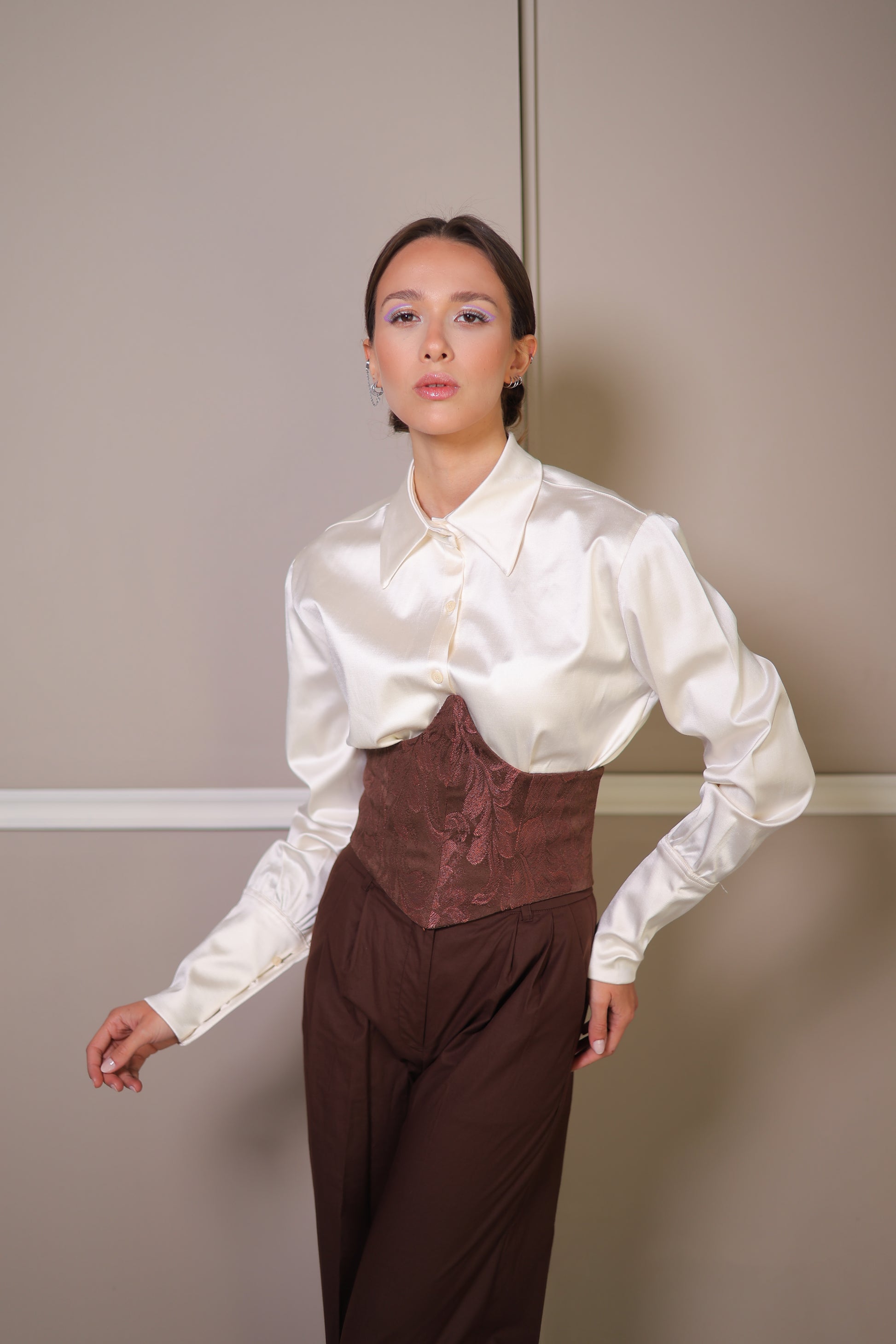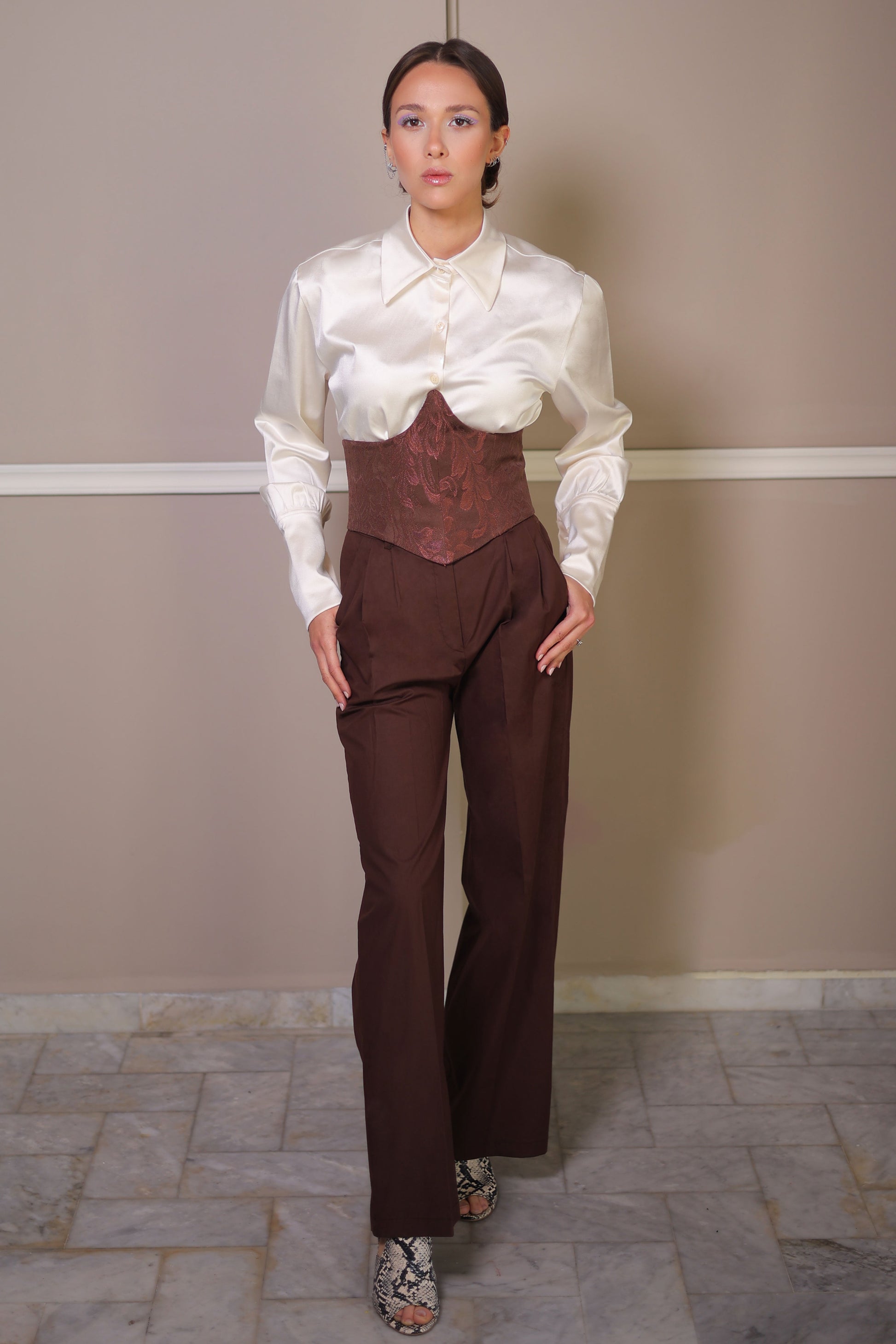 Corset-Satin Chemise In Cream White With Brown Detailing